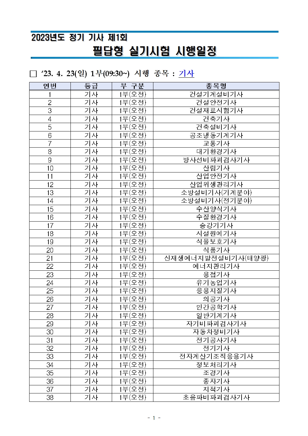 | 다음글 | 2023년 기사 제1회 필기시험 원서접수 관련 수험자 주요사항 안내 |
